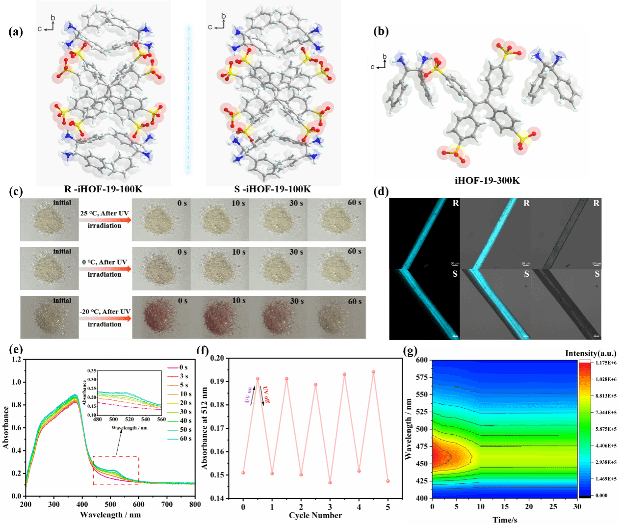 (3). R/S-iHOF-19首次将离子型氢键有机框架材料应用于光致变色和CPL材料交叉领域。将光致变色特性与圆偏振发光特性集成于同一材料体系中,实现光响应与手性发光的协同作用。实现了在同一个分子结构中将温度、溶剂双重控制的智能响应光致变色和圆偏振发光性实现完美的集成融合,并对其构效关系和相互作用机理进行深入的研究和讨论。并且,结合多学科特性,将光致变色和CPL技术与信息加密需求匹配,推动功能晶态材料在信息加密领域的创新应用。